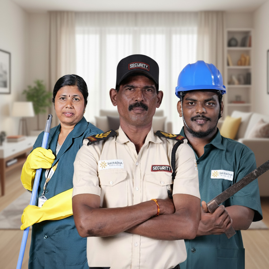 At Sai Radha Services, we are committed to simplifying life for our clients by providing skilled and semi-skilled workforce solutions across multiple sectors. Our focus is on maintaining clean, safe, and functional residential and commercial spaces with efficiency and professionalism